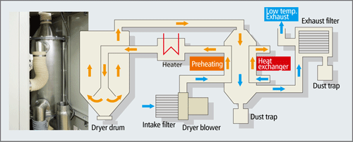 The hot air after drying is cooled by the heat exchanger before release into the factory, therefore the rise in room air temperature is kept down, hence reducing air conditioning demand. The energy-saving effect is high when several NF series machines are introduced throughout the factory.