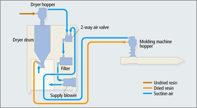 Feed blower capacity can be increased if the standard dryer has trouble supplying molding machines because of longer conveying distances or heavy resin weights.