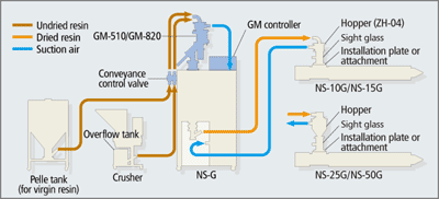 The NS series can supply dried resin stock to 2 -- 4 molding machines using multiple feed branch lines and air branch valves.