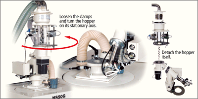 A line filter can be installed on the molding machine hopper to thoroughly remove dust. Applicable models are GF-20-002 and GF25-002.
