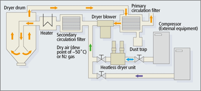 The NX Round System incorporates a multiple-stage filter into STOLZ’s Round System that supplies and circulates at a determined flow rate dehumidifying air of –50˚C generated by a heatless dry air unit through a closed system consisting of a completely airtight blower, heater and dryer drum.