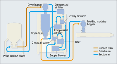 The closed conveying system transfers plastic to the molding machine over an airtight circuit using suction force. Because secondary air is not drawn into the circuit, it shuts out moisture found in the surrounding environment, thus enabling thorough drying.