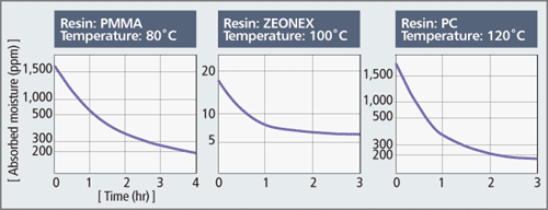 No matter which engineering plastic resin is used, the DEZAT NX series demonstrates exceptional drying performance that improves molding precision. Operations can be smoothly resumed from the stopped state, as stock in the drum does not absorb moisture while the system is not running.