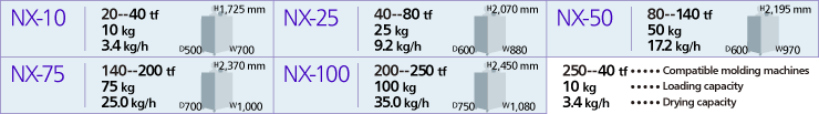A line filter can be installed on the molding machine hopper to thoroughly remove dust. Applicable models are shown in the table.