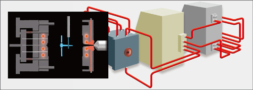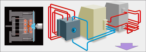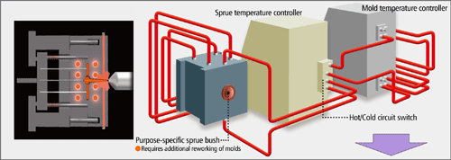 In the cooling process, the cooling circuit opens to supply cooling water to a purpose-specific bush and cool the sprue. This process quickens sprue solidification.